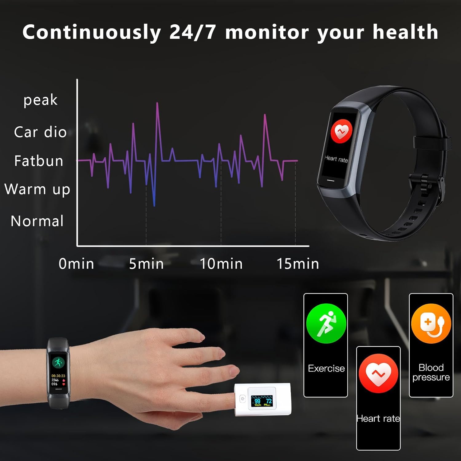 With its sleek black design, this fitness tracker is perfect for everyday wear. Stay connected with notifications for calls, texts, and social media alerts right on your wrist. Take control of your health and fitness with our Fitness Tracker with 24/7 Heart Rate Sleep Blood Oxygen Monitor.